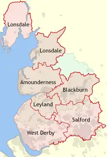 The Domesday Book of 1086 AD identifies King William the Conqueror's tenants-in-chief for historic Lancashire within Cestrescire (Cheshire) and Eurvicscire (Yorkshire).[1] At the time of the Norman Conquest of England, the County of Cheshire included Inter Ripam et Mersam (between the River Ribble and River Mersey) which became South Lancashire (now including parts of Merseyside and Greater Manchester), while the West Riding (West Treding) of the County of Yorkshire included what became North Lancashire.[2]