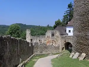 Landštejn Castle (Czech: hrad Landštejn) is a 13th-century castle in Staré Město pod Landštejnem in Jindřichův Hradec District in the South Bohemian Region of the Czech Republic. The first written record of the castle is from 1231, at which time it was the largest Romanesque castle in the Czech lands. It is one of the oldest and best preserved such structures in Europe. The two large towers are connected by a wall defining the upper castle and its courtyard. The six-story southern tower is the main tower and is fully preserved, including a gate in the western wall.