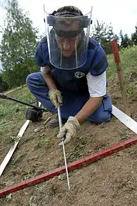 Land mine clearing is done by various government agencies and NGOs as well as some NATO military units. Between 1996 and 2017, more than 3,000 square kilometres have been cleared of mines. Bosnia and Herzegovina's strategic vision in 2008 was to clear all land mines by the year 2019. In April 2017, experts thought it would take at least five years longer, citing a lack of funds as the primary hurdle. 80,000 mines were estimated to be yet uncleared, located across 2.2% (1,125 km2) of the Bosnian territory.[4][5] In December 2017, the deadline was moved to 2025, but experts believe that this is an unreasonable goal based on the lack of financial resources. Some suggest that it could take several more decades.[6] According to the Bosnia and Herzegovina Mine Action Centre, the landmine contamination problem impacts over 538,000 people in over 1,400 communities (around 15% of the population).[1]
