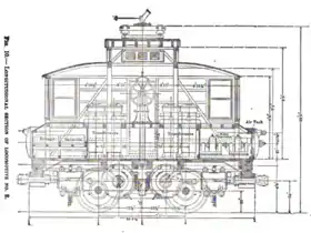 On February 3, 1902, the company completed a 18.5-mile (29.8 km) line as far as St. Johns. On entering Lansing trains joined the Cedar Street line of the local streetcar system. The electrical systems were not yet ready, so the railroad was operated by steam locomotives supplied by the Michigan Suburban Railroad. Arnold's account states that steam service began on November 15, 1901; Meints puts the completion of the line in February 1902.[2][3] Construction of the overhead lines was finished by December 1902, and tests began the following March. The first trial trips occurred on June 15, 1903, using a specially-built experimental locomotive. The company had ordered three interurban cars from the Jewett Car Company of Jewett, Ohio. These were of wooden construction, 56 feet 5 inches (17.20 m) in length, capable of seating 50 passengers, but at that stage Arnold's experimental motor lacked the motive power to drive them. A new locomotive fitted with two motors was readied for tests in early December, but a fire swept through the company's car house, destroying the locomotive, two of the Jewett cars, and a steam locomotive. While engineers constructed a new locomotive, "Phoenix," the company rebuilt the line to permit DC operation, thereby allowing Lansing streetcars to operate over it. On August 3, 1904, the new locomotive made a trial run of 8 miles (13 km) out to DeWitt. A blown circuit breaker ended the test prematurely.[4][5]