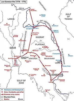 Lao–Siamese War or the Siamese Invasion of Laos (1778–1779) is the military conflict between Thonburi Kingdom of Siam (now Thailand) and the Lao kingdoms of Vientiane and Champasak. The war resulted in all three Lao kingdoms of Luang Phrabang, Vientiane and Champasak becoming Siamese tributary vassal kingdoms[1] under Siamese suzerainty and domination in Thonburi and the subsequent Rattanakosin Period.