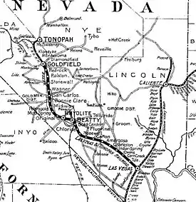 The Las Vegas and Tonopah Railroad was a 197.9-mile (318.5 km) railroad built by William A. Clark that ran northwest from a connection with the mainline of the San Pedro, Los Angeles and Salt Lake Railroad at Las Vegas, Nevada to the gold mines at Goldfield. The SPLA&SL railroad later became part of the Union Pacific Railroad and serves as their mainline between Los Angeles and Salt Lake City.