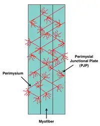 Attachment of the perimysium to the endomysium at the perimysial junctional plates (PJPs).