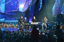 The Latvian performance featured the members of PeR wearing silver and black glittery costumes and joined on stage by two backing performers, one of them which played an electric guitar with LED screens attached. Toward the end of the song, the performers moved towards the catwalk and group member Ralfs Eilands concluded the performance with a stage dive.[24][25] The stage and background LED screens displayed colourful rotating spotlights. The choreographer for the Latvian performance was Adrienne Åbjörn.[26] The two backing performers that joined PeR were: the co-composer of "Here We Go" Arturas Burke and Lauris Valters.[27]