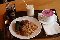 Latvian cuisine has been influenced by other countries of the Baltic rim.[1] Common ingredients in Latvian recipes are found locally, such as potatoes,[2] wheat, barley, cabbage, onions, eggs and pork. Due to pronounced four seasons, the Latvian cuisine is markedly seasonal and each time of the year has its own distinctive products and dishes.[3] Latvian food is generally quite fatty and uses few spices.[4]