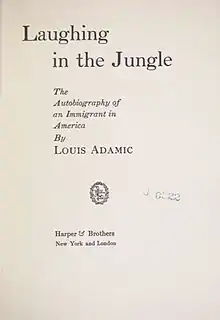 Laughing in the Jungle, published in 1932, is an autobiography by a Slovene-American writer Louis Adamic. As a fourteen year old, Adamic immigrated to the United States in 1913 from Carniola (Kranjska), at that time a part of the Austro-Hungarian Empire. In Adamic’s words, Laughing in the Jungle was an attempt to explain his experiences as an immigrant to America.[1] The title of the book, Laughing in the Jungle, was inspired by Upton Sinclair’s 1906 book The Jungle. Adamic for the first time learned about the book from his Carniolan neighbor, Peter Molek, who said to him that “the whole of America is a jungle… [that] swallows many people who go there to work.”[2] At first, Adamic did not understand Molek’s point, but after sixteen years in America, he came to believe that the United States “is more a jungle than civilization” where one can survive only with “knowledge and understanding of the scene, with a sense of humor.”[3]