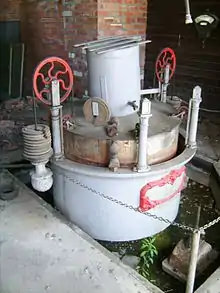 Inside, the coal was transported to the top level where it was deposited in a long hopper at the top level of the building (which also contains the conveyor drive and water tank). From the hopper, the coal was fed via a single chute into the vertical retort block which was then divided into 8 separate retorts, where it was heated by furnaces (and later an additional steel furnace in the back room) located on the first floor (ground level). The extracted gas was collected in two parallel "Collector Mains" running along the top of the retort block. Accumulated tar and liquor was drained from the collector mains into a small liquor separating tank on the 3rd floor on the western side of the building. The collected gas was forced through the retort governor (recently removed for scrap) and into the foul main that runs down the back of the retort house where it was purified elsewhere on the site. Like the Horizontal Retorts, the Vertical Retort was run on Newcastle Coal imported from New South Wales. In the 1950s, modifications were made to the gasworks to allow the site to use Fingal Coal from the Fingal Valley in north east Tasmania.