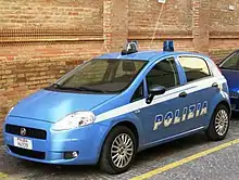 - Polizia di Stato vehicles are light blue with a white stripe along the side and the word POLIZIA in large letters underneath. The license plates start with the word Polizia in red usually followed by a letter and four numbers.[50] Like the Carabinieri vehicles, the cars were green, but before the green colour, the cars were red.