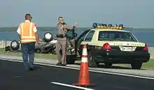 A Florida Highway Patrol trooper and a government worker at the scene of a traffic collision