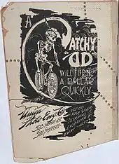 Burgess also explicitly names his influencers in "Our Clubbing List", an alphabet of the magazine's "admired and disdained contemporaries".[24] He credits illustrator Aubrey Beardsley amongst his admired contemporaries as "the idol supreme, / Whose drawings are not half so bad / as they seem".[25] Beardsley's influence is visible in the bold black-and-white graphics of the magazine's cover.[26] The woman on the far right of the cover is reminiscent of the women of Beardsley's The Yellow Book, while the Japanese actor on her left resembles the figures in the Japanese prints popular in the nineteenth century.[27] The Native American figure next to the Japanese actor belongs to the world of the “Old West” prints produced by Karl Bodmer and his contemporaries.[28] On the left of the Native American figure is a skeleton, a regular figure in the “sophomoric humor world”, which also re-appears on the magazine's back cover in a humorous take on the female-centric, period bicycle posters created by Georges Massias and Will H. Bradley.