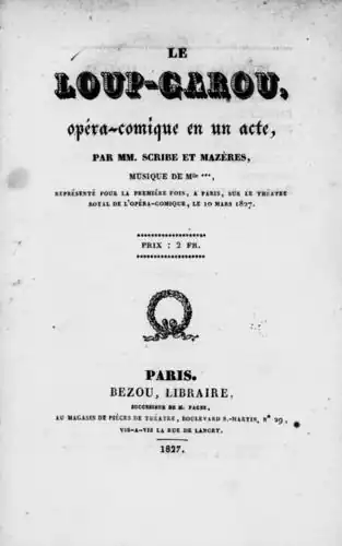 19. Bertin, Louise; Scribe, Eugène; Mazas, Jacques Féréol (1827). Le loup-garou, opéra-comique en un acte (in French). Paris: Bezou. OCLC 24105214.