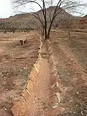 Lee started construction of the first earthen dam on the Paria River in January 1872 and by March irrigated his first crop. By April this first dam washed out. Lee soon replaced the dam reinforced with a large base log packed with brush, rocks, and dirt. The dam was subsequently washed out and rebuilt many times over the coming years. In 1883, in order to bring water to an upper field, Warren Johnson constructed a dam on a second site higher up the Paria. By 1900, the dams were replaced with new ones made of logs and sandbags. In 1905, Irving Pierce constructed a tunnel-and-flume delivery system to replace the ditches bringing water from the upper dam to the fields. By the time Leo Weaver bought the ranch in 1935, several more dams had been washed out. Weaver's attempt to replace the dams also failed. Gus and Warren Griffin made improvements upon the system, including a stone lined ditch. Most of what exists today is related to the Griffin improvements In 1965, the consortium that owned the ranch created two holding ponds for irrigation water against the west wall of Paria canyon. In 1977, the National Park Service pumped water from the Colorado River instead of the Paria. The Park Service constructed a new holding tank near the south end of the site, at the same time removing remains of the flume system and valve platform for a trail. This system remains in use as of 1999.[6]
