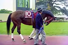 After an absence of more than eight months, Legacy World returned in the Grade II Kyoto Daishoten over 2400 metres on 10 October and finished second of the ten runners to Mejiro McQueen. On 28 November, in front of a record crowd of 175,000,[8] the gelding made his second attempt to win the Japan Cup, a race which pitted seven Japanese horses against nine overseas challengers, and started at odds of 11.5/1. The other Japanese runners were Winning Ticket (Tokyo Yushun), Rice Shower, Mejiro Palmer, Matikanetannhauser (third in the Kikuka Sho), Nice Nature and the dirt racer Hashiru Shogun (Teio Sho). The North American contingent comprised Kotashaan (the 4.2/1 favourite), Star of Cozzene and Luazar (Del Mar Handicap) whilst Europe was represented by White Muzzle (Derby Italiano) from Britain, Urban Sea from France, Misil (Premio Roma) from Italy and Platini (Gran Premio di Milano) from Germany. The other two runners were Naturalism from Australia and The Phantom Chance from New Zealand. Kawachi tracked the leaders and reached the final turn in second place behind Mejiro Palmer before taking the lead in the straight. He stayed on strongly in the closing stages to win by one and a quarter lengths with Kotashaan taking second in a three-way photo finish from Winning Ticket and Platini.[9] Kent Desormeaux, the rider of the runner-up, was fined by the racecourse stewards after he mistook the finish line and stopped riding 100 metres from the end of the race.[8] After the gelding's victory, Hideyuki Mori said "The horse was very lightly raced. Legacy World was therefore a fresh horse, specially prepared for the Japan Cup. This was his target". Kawachi, who was winning the race at the fifth attempt commented "I was secretly confident the big chance was today".[10]