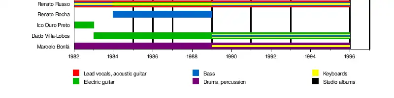 Legião Urbana was initially formed by Renato Russo (vocals and bass) Marcelo Bonfá (drums), Eduardo Paraná (guitars) and Paulo Paulista (keyboards), but Paraná and Paulista would quickly leave the band. Ico Ouro Preto replaced Paraná as the guitarist. Dado Villa-Lobos replaced Ouro Preto in 1983. In the beginning of 1984, Renato Rocha joined the group as the bass player. Renato Russo would then focus on the vocals. He also played keyboards and acoustic guitar.