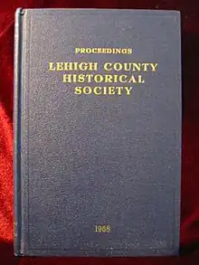 Proceedings, the journal of the Lehigh County Historical Society, was published on a bi-annual basis since 1906[3] and featured articles focusing on local and regional history. From 1947 to 1994, the publication was bound in a distinctive blue buckram hardcover binding with gilt lettering. In 1994, the journal was published in softcover. Publication of Proceedings was discontinued in 2004.