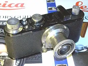 The Leica Standard was introduced as a basic model by Ernst Leitz, Wetzlar in October 1932. The camera began production in the same year as the Leica II with a coupled rangefinder. The Leica III with lower shutter speeds was introduced in 1933; this model would later have the faster speed of 1/1000 sec with the IIIa of 1935, though the Leica III would continue in parallel production for several years. All these models use the standardised lens mount with distance from film plane to lens flange fixed to 28.8 mm, a Leitz standard. This feature was first seen on late Leica I model C cameras in 1931, and all Leica II, Model D from 1932, identified by a "0" (zero) stamped on the lens mount flange at the top, to indicate the implementation of the standard, a practice that was continued for some time. It is found on early Leica Standards as well. On the back of these models there is a hole covered by a black plug, presumably for back focus calibration. The original lens for the Leica Standard when introduced was the Leitz Elmar 1:3.5 F=50mm in a collapsible nickel-plated focusing mount with infinity catch.[1]