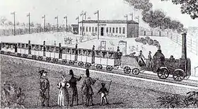 On 7 April 1839, on the completion of the Elbe bridge at Riesa, the entire route from Leipzig to Dresden was finally opened. The travel time between Leipzig and Dresden was three hours and 40 minutes.[4] On this occasion, a coin was issued with an engraving of an English B locomotive, which ran over the line in the early years.[5]