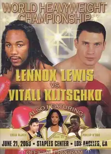 Lennox Lewis vs. Vitali Klitschko, billed as Battle of the Titans, was a heavyweight professional boxing match contested between WBC, IBO, and The Ring champion Lennox Lewis and former WBO champion Vitali Klitschko. The bout took place on June 21, 2003 at the Staples Center in Los Angeles, California. Lewis defeated Klitschko via sixth-round technical knockout (TKO) after the fight was stopped due to a severe cut above Klitschko's left eye. It was the last fight of Lewis' career, having decided to retire after eventually rejecting a rematch.