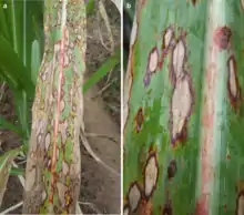 Leptosphaeria sacchari is an ascomycete fungus whose only known host is sugarcane. The infection occurs on the leaves of lower canopy of the crop and starts out as small bronze spots. The spots elongate to become longer, irregular-shaped lesions (2.5 to 5 mm x 10 to 18 mm) with red-brown borders. The spots can merge and cause leaf chlorosis and later necrosis. In older lesions, L. sacchari can form small, black dots, but usually only on older leaves. These black dots can be identified as perithecia and pynidia.[4]