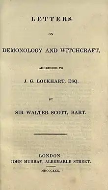 Letters on Demonology and Witchcraft Addressed to J. G. Lockhart, Esq. (1830) was a study of witchcraft and the supernatural by Sir Walter Scott. A lifelong student of folklore, Scott was able to draw on a wide-ranging collection of primary and secondary sources. His book found many readers throughout the 19th century, and exercised a significant influence in promoting the Victorian vogue for Gothic and ghostly fiction. Though on first publication it met with mixed reviews, it is now recognised as a pioneering work of scientific anthropology, treating of its subject in an acute and analytical way which prefigures later scholarship on the subject, as well as presenting a highly readable collection of supernatural anecdotes.