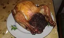 The stuffing is prepared by mincing the onions, squeezing them into a cloth to remove the left over juice and mixing all ingredients (crushed walnuts, onions, raisins, narsharab).[6]The chicken is first wiped with salt and pepper and then stuffed with the mentioned mixture and then sewed. Outside of the chicken is rubbed with vegetable oil and cherry-plum paste and baked in medium oven until turn red.[6][14]