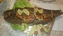 Levengi or Lavangi (Azerbaijani: Ləvəngi; Talysh: Ləvəngin) is a national dish of Azerbaijan[1][2][3] and the Talysh people.[4] Its also present in Iranian cuisine. It is a fish or chicken stuffed with walnuts, onions and various condiments and baked in the oven. Lavangi is most prevalent in the Absheron Peninsula of Azerbaijan and in the Lankaran, Lerik, Astara, Masally, Salyan and Neftchala districts.[5] Lavangi is prepared from fish, chicken, duck and aubergine.[6][7][8][9]