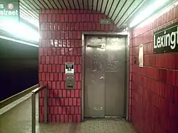 There are 3 exits leading to Lexington Avenue that were built as part of the original 1989 station, along with 4 exits to Third Avenue[80] that were built as part of the Second Avenue Subway.[32][48] The elevator between the street level and mezzanine at Lexington Avenue was replaced in August 2015.[81]: 6 [82]