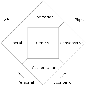 In the United States, libertarian is a typology used to describe a political position that advocates small government and is culturally liberal and fiscally conservative in a two-dimensional political spectrum such as the libertarian-inspired Nolan Chart, where the other major typologies are conservative, liberal and populist.[78][126][127][128] Libertarians support legalization of victimless crimes such as the use of marijuana while opposing high levels of taxation and government spending on health, welfare and education.[78] Libertarians also support a foreign policy of non-interventionism.[129][130] Libertarian was adopted in the United States, where liberal had become associated with a version that supports extensive government spending on social policies.[72] Libertarian may also refer to an anarchist ideology that developed in the 19th century and to a liberal version which developed in the United States that is avowedly pro-capitalist.[21][22][25]