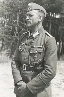 Grauel was replaced with SS-Untersturmführer (equivalent to a second lieutenant) Wolfgang Kügler on July 10 or 11.[15] Under Kügler's supervision, massacres occurred at a rate of about twice a week. Shootings of small groups of Jews continued after July 10, happening every evening. These were organized by Kügler.[18] Often these were of less than 10 individuals, which was a pattern particular to Kügler's administration in Liepāja. The exact number of those killed in these actions is not known, but was estimated by Anders and Dubrovskis to be 81 individuals plus or minus 27.[8][18] Anders and Dubrovskis estimate the total number of victims to be 387 individuals, plus or minus 130.[8] Otto Fischer, Jewish football coach and former Austrian national team player, was killed in the massacres in July.[19]