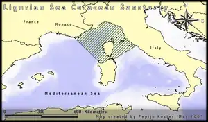 Originally called the International Ligurian Sea Cetacean Sanctuary (Ligurian Sea Sanctuary), what is now known as the Pelagos Sanctuary for Mediterranean Marine Mammals is a Marine Protected Area aimed at the protection of marine mammals (cetaceans). It covers an area of approximately 84,000 km2, comprising the waters between Toulon (French Riviera), Capo Falcone (western Sardinia), Capo Ferro (eastern Sardinia) and Fosso Chiarone (Tuscany).
