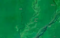 The course of the Likouala meanders and shifts over time.[2] The coefficient of sinuosity is more than 1.5 in the upper section, around 2.0 in the middle section and in the lower section as high as 2.8.[5] The lower sections of the Sangha and Likouala-aux-Herbes flow through flat land with little difference in elevation between the two rivers. Part of the lower section of the Sangha River divides into two meandering channels, which then recombine. Further down, a "canal" connects the Sangha and Likouala-aux-Herbes some distance above the main confluence of the two rivers.[6] Not long ago the Likouala-aux-Herbes joined the Sangha 130 kilometres (81 mi) upstream from the present confluence.[2]
