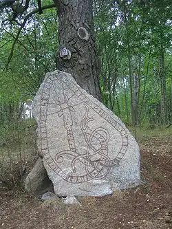 Runic inscription U Fv1972;172 is the Rundata catalog number for a granite runestone that is 1.6 meters in height. It was discovered while digging a trench for an electrical cable on December 19, 1971, and raised at this spot, which is believed to be the stone's original location.[1] Its inscription consists of an intertwined serpent that is above a runic band that cuts across the bottom of the inscription. This inscription is classified as being carved in runestone style Pr4, which is also known as Urnes style.