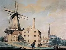 The old windmill was replaced by a Dutch smock mill erected in 1783. In 1832 the complex was expanded with a four-story steam mill. Together the two mills acted as a grain mill, supplying the citizens of Copenhagen with flour. At the end of the 19th century the mill cap was disassembled and for a while the mill was used by the military for storing straw needed for some nearby barracks, both as fodder for the horses and bedding for the soldiers whose mattresses needed an occasional refill.[4] In 1909 the steam mill was put out of operation.