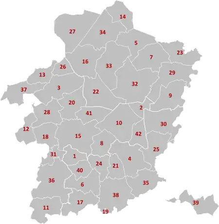 The province of Limburg has an area of 2,427 km2 (937 sq mi) which comprises three arrondissements (arrondissementen in Dutch) containing 44 municipalities. Among these municipalities are the current capital Hasselt, Sint-Truiden, Genk, and Tongeren, which is the only Roman city in the province, and regarded as the oldest city of Belgium. As of January 2019, Limburg has a population of 874,048.[5]