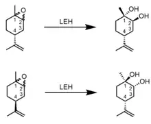LEH also has a preference for specific stereoisomers of its substrate. It reacts with all (1R,2S) limonene epoxides before it begins hydrolysis of the (1S,2R) stereoisomers. The presence of (1S,2R) substrates does not decrease the speed of reaction with the preferred stereoisomers, suggesting that the (1S,2R) limonene epoxides are weak competitive inhibitors.[8]