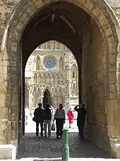 The west front of Lincoln Cathedral viewed through the Exchequer Gate, one of a number of surviving gates in the Cathedral Close walls