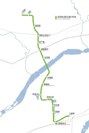 Line 2 of Luoyang Subway (Chinese: 洛阳轨道交通2号线) is the second metro line to open in Luoyang, Henan, China, which opened on 26 December 2021.[1] The line is currently 18.216 km (11.319 mi) long with 15 stations.[2]