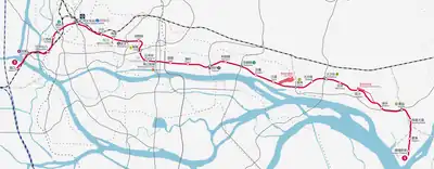 Line 5 of the Guangzhou Metro runs from Liwan District to Huangpu District. It starts at Jiaokou running 41.7 km (25.91 mi) in a wide "∩" shape and ends at Huangpu New Port. Like lines 4 and 6, it is equipped with linear induction motor technology. Line 5's color is red. Line 5 began operation on 28 December 2009, from Jiaokou to Wenchong.[4] On December 31, 2009, Line 5 set a record of 567,000 daily passengers, surpassing the ten year ridership projections in the span of just 4 days after its opening. As of May 2017, Line 5 carries an average of 1.05 million passengers per day and is extremely congested throughout the day, operating at over 100% capacity during rush hours.[5][6] The opening of Phase I of Line 13 further increased traffic demand on the west end of Line 5 and pushing congestion to over 130% capacity.[7] Prompting the Guangzhou Metro to limit passenger traffic at a number of subway stations on Line 5.[7] In 2018, the busiest section of Line 5 reaches over 50,000 pphpd of traffic volume during peak periods.[8] By 2019, the line was used by 1.18 million passengers each day.[2] In the future Line 13 Phase II will provide relief for Line 5. On 28 December 2023, the line was extended to the east from Wenchong to Huangpu New Port.[9]