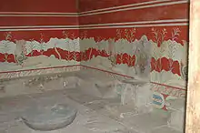 ![]() | Griffin Fresco | Knossos | Minoan or Mycenaean | LM II | In situ | Griffins couchant in a background of rocks and lilies. |