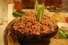 Kitfo Ethiopia and Eritrea Raw beef marinated in mitmita (a chili powder based spice blend) and niter kibbeh.