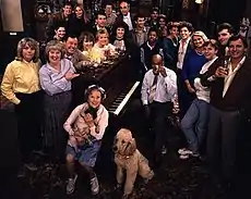 A photo of most of the main characters and animals who first appeared in EastEnders in 1985