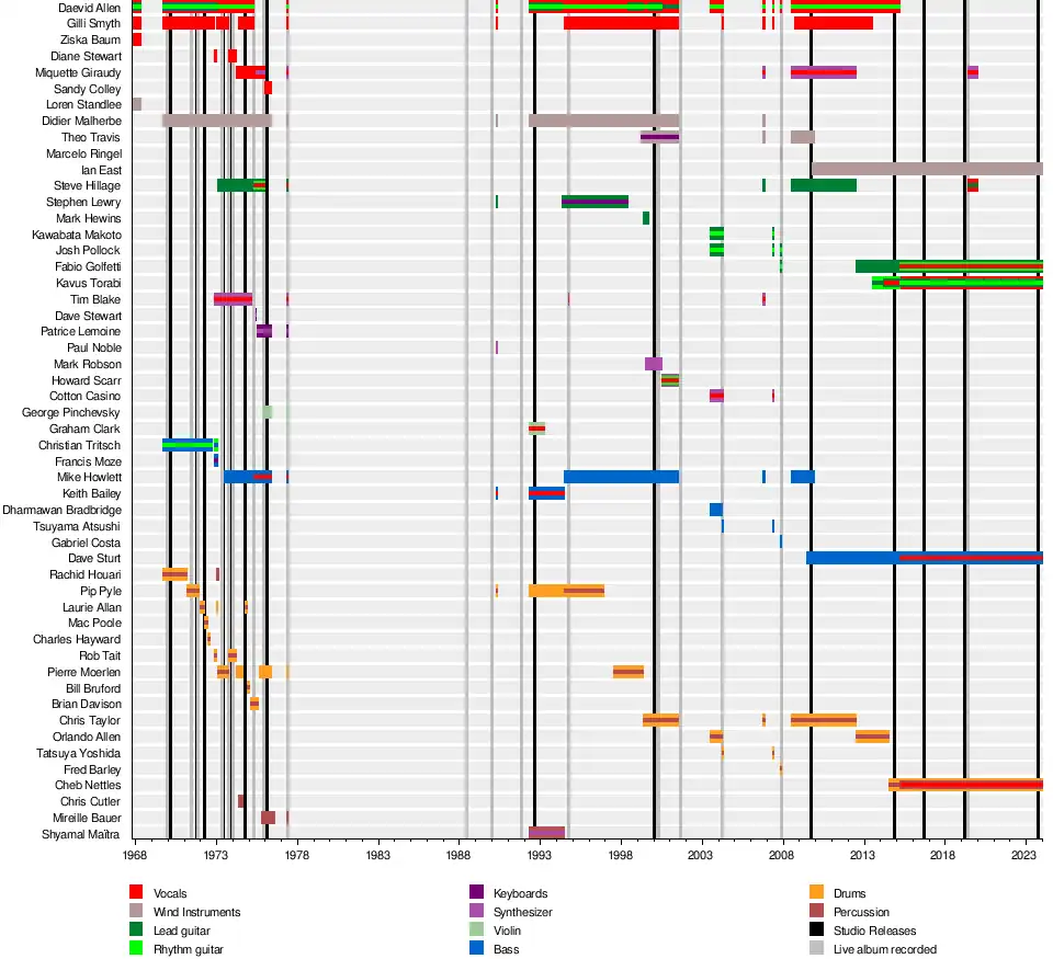 Gong are a Franco/British rock band founded by Australian vocalist/guitarist Daevid Allen and English vocalist Gilli Smyth in 1967.[1] The bands first recording line-up featured Allen and Smyth alongside bassist Christian Tritsch, drummer Rachid Houari and saxophonist/flautist Didier Malherbe.[2] The band's current line-up from Allen's death on 13 March 2015 features lead guitarist Fabio Golfetti (in 2007 and since 2012), bassist Dave Sturt (since 2009) saxophonist/flautist Ian East (since 2010), vocalist/guitarist Kavus Torabi (since 2014) and drummer Cheb Nettles (since 2014).[3]