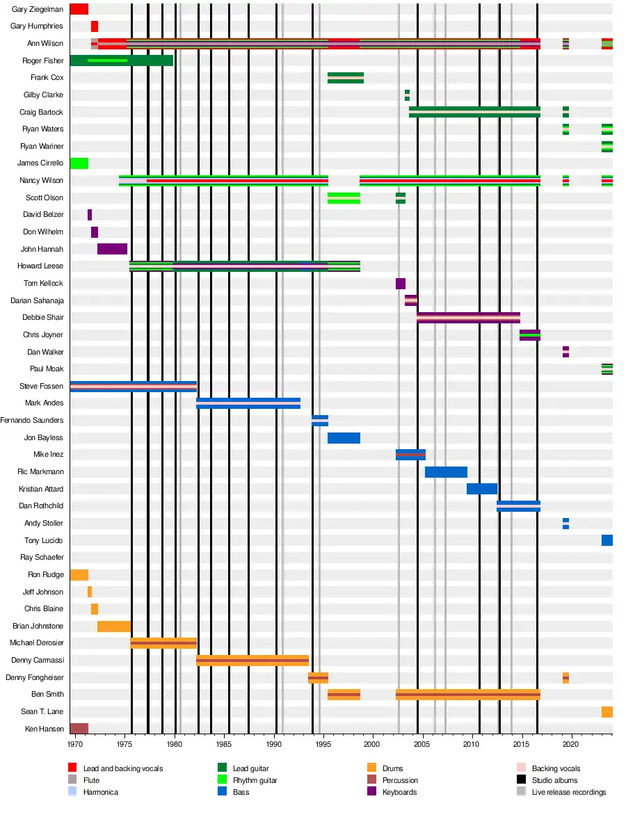 Heart is an American rock band from Seattle, Washington. Formed in 1967, the group later consisted of vocalist Ann Wilson, guitarist Roger Fisher, bassist Steve Fossen, drummer Brian Johnstone and keyboardist John Hannah. Shortly after the group's formation, Wilson's younger sister Nancy joined as rhythm guitarist, Johnstone was replaced by Michael Derosier and Hannah by Howard Leese. The band's current lineup includes the Wilson sisters, guitarist Ryan Wariner, keyboardist Paul Moak, bassist Tony Lucido and drummer Sean T. Lane (all since 2023).
