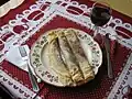A cabbage roll made from pickled cabbage, filled with a light minced pork meat and rice mix. It may contain minced paprika and be served in a tomato sauce with sour cream, but this is not always the case (as in the picture). It is frequently eaten around Christmas and New Year's, but can still be eaten year-round. | |