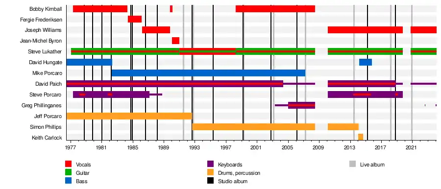 Toto is an American rock band from Los Angeles, California. Formed in 1977, the group's original lineup included lead vocalist Bobby Kimball, guitarist and vocalist Steve Lukather, keyboardist and vocalist David Paich, bassist David Hungate, keyboardist Steve Porcaro and drummer Jeff Porcaro. The current lineup features constant member Lukather, and lead vocalist Joseph Williams (who originally joined in 1986, and rejoined in 2010). The band also tours with several additional musicians, currently bassist John Pierce (since 2020), drummer Shannon Forrest (since 2024, originally from 2014 to 2019), keyboardists Greg Phillinganes (since 2024, originally from 2003 to 2008) and Steve Maggiora (since 2020), and multi-instrumentalist Warren Ham (since 2017, and originally from 1986 to 1988). Paich is still in the band as a music director, but medically unfit to tour.[1] He still makes guest appearances at random select concert dates.
