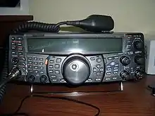 The Kenwood TS-2000 is an amateur radio transceiver manufactured by the Kenwood Corporation.[24][25][26] Introduced in the year 2000, the radio was known for its "all-in-one" functionality. It can transmit on all amateur radio bands between 160 meters and 70 centimeters, with the exception of the 1.25 meters and 33 centimeters bands, and the "X" model also has built-in 23 centimeters band capability option. Kenwood discontinued production of the TS-2000 in September, 2018.[27]