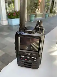 FT-221The FT-221 is a modular VHF 2M all mode (SSB, AM, CW and FM) amateur radio transceiver, produced during the 1970s. Technical descriptionOther model variantsThe FT221R is a model with repeater shift. The FT221RD also has a digital display. FT-857![]() FT-857 ![]() FT-857D The Yaesu FT-857 is one of the smallest MF/HF/VHF/UHF multimode general-coverage amateur radio transceivers.[46] The set is built by the Japanese Vertex Standard Corporation and is sold under the Yaesu brand. [47] The FT-857 is developed on the FT-897 and MARK-V FT-1000MP transceivers.[46] Technical specifications