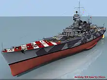In the interwar period, the Italian Navy—along with the rest of the major naval powers—was limited by the Washington Naval Treaty, which granted Italy parity with the French Navy.[9] The Italians had 70,000 long tons (71,000 t) worth of battleship tonnage available for new vessels before they would reach their treaty limits, but they avoided new construction in the 1920s due to severe budgetary problems and to avoid a naval arms race with France.[10][11] These financial limitations also forced the Italians to scrap Dante Alighieri in 1928.[12][13] Nevertheless, the Regia Marina decided to make use of its excess tonnage by the early 1930s, which resulted in the four Littorio-class battleships. Two were finished early in World War II and were used extensively to escort convoys during the North African Campaign. The third ship, Roma, was finished in 1942, but was sunk in September 1943 by a German radio-controlled bomb when Italy surrendered to the Allies. The fourth ship, Impero, was never finished and was instead sunk by American bombers and scrapped after the end of the war. The two surviving ships, Littorio and Vittorio Veneto, were surrendered to the Allies and were later broken up for scrap.[14] Of the surviving members of the Conte di Cavour class, Conte di Cavour was scrapped after the end of the war and Giulio Cesare was surrendered to the Soviet Union as war reparations. Only the two Andrea Doria-class battleships survived in Italian service for any significant length of time after the conclusion of hostilities; both served as training ships until the mid-1950s, when they too were broken up for scrap.[5]