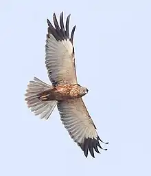 Bustards are large terrestrial birds mainly associated with dry open country and steppes in the Old World. They are omnivorous and nest on the ground. They walk steadily on strong legs and big toes, pecking for food as they go. They have long broad wings with "fingered" wingtips and striking patterns in flight. Many have interesting mating displays.
