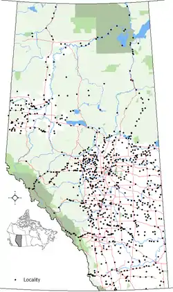 Alberta had 864 localities within its Geographical Names System (GNS) in October 2020.[2] Excluding municipalities, hamlets, and airports, Statistics Canada recognized 2,342 localities in Alberta in its 2006 Census of Population,[3] of which 830 are also in Alberta's GNS. Between the two authorities there are 2,372 localities in Alberta.